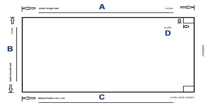 • ! : geef a.u.b. aan op uw tekening waar de ogen in het zeil komen. (voor, achter, zijkanten)